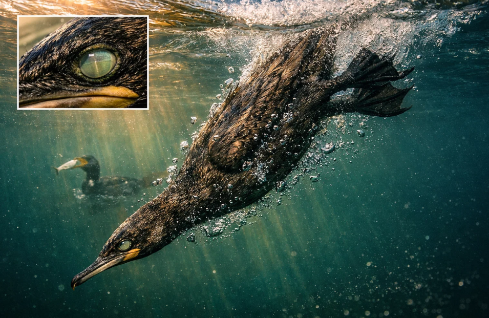Охота в мутной воде или на глубине, куда проникает мало света, требует особых зрительных адаптаций. Глаза баклана обладают высокой светочувствительностью и особым строением хрусталика, который может изменять форму, обеспечивая четкое зрение как в воздушной, так и в водной среде. Под водой зрение баклана становится близоруким, что идеально для охоты на подвижную рыбу на небольшом расстоянии. Кроме того, у птицы есть третье веко — мигательная перепонка, которая действует как естественные очки, защищая глаза и улучшая видимость под водой.