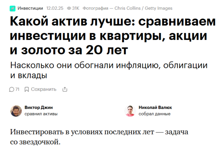 Но на большинстве горизонтов вторичка уступила депозитам — например, в 2023 и 2024 годах из-за аномально высокой доходности последних. А также на горизонтах 10—20 лет, в частности из-за того, что с 2008 по 2018 год рынок недвижимости стагнировал. Еще на этот период пришлись мировой ипотечный кризис и "геополитическое обострение" 2014 года.