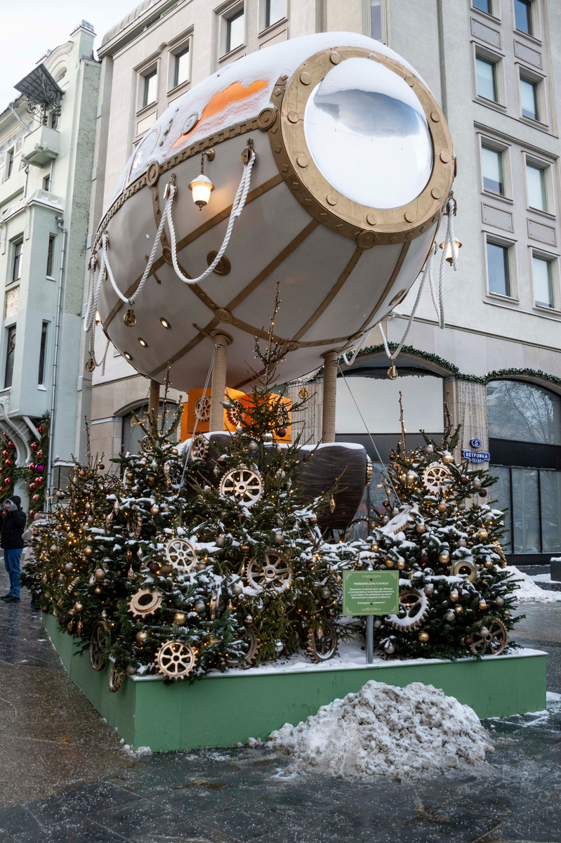 Захожу на площадку со стороны улицы Петровка. Сама площадка на карте проекта "Зима в Москве" называется "Механика чудес" на Кузнецком Мосту. Первое, что я вижу - огромный дирижабль. Стилизация, конечно, он не настоящий. Игрушечный. Мы же игрушками елки украшаем. А эта большая игрушка на елку не поместилась, поэтому играем в самодостаточность. Елки внизу.