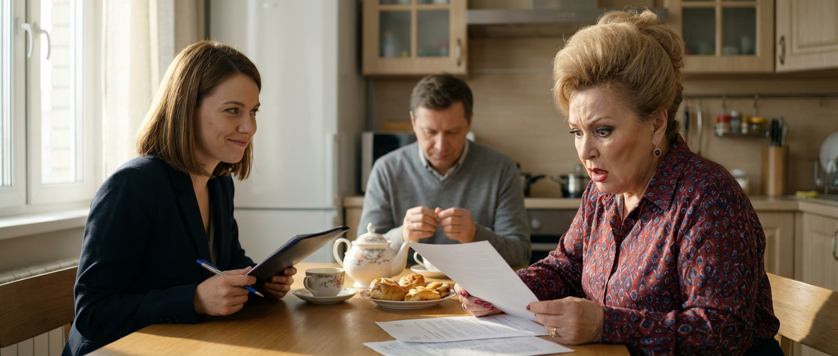 В комнате повисла тишина. Слышно было только, как тикают настенные часы. Раиса Захаровна смотрела то на договор, то на меня, то на Андрея. Муж сидел, опустив голову, и старательно изучал узор на скатерти.