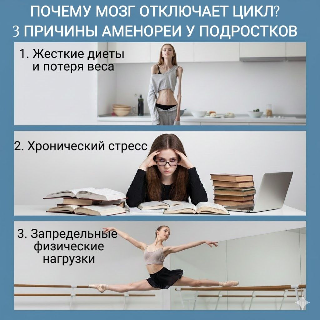 1. Жёсткие диеты и потеря веса. Тело умное. Оно знает: для продолжения рода нужны ресурсы. Если жировой ткани становится критически мало (резкая потеря 10-15%), мозг получает сигнал: «Тревога! Ресурсов на р