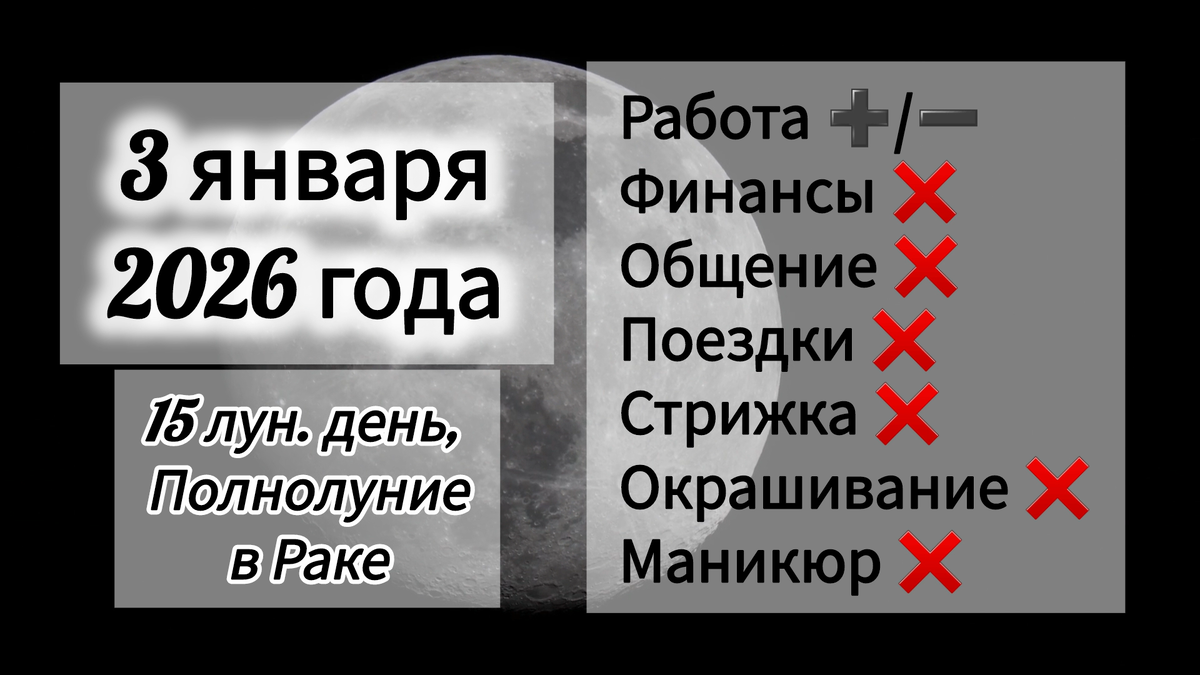В первой половине дня продолжается сатанинский 15 лунный день. Всех нас переполняет энергия наступающего Полнолуния. Контролировать эмоции очень сложно. Старайтесь не провоцировать конфликты, будьте терпеливы к окружающим. Посвятите это время отдыху и уединению. При выполнении любых задач высока вероятность непродуманных решений и ошибок, а также повышен травматизм. В 13 часов 02 минуты наступит Полнолуние в знаке Рака, а значит во второй половине лунного месяца в центре внимания будут вопросы семьи, отношений, партнерства, личных границ, баланса дом-работа. Сконцентрируйтесь на своих внутренних эмоциях и ощущениях. Разберитесь, с чем Вы готовы мириться дальше, а где нужно вносить ясность в отношения. Не игнорируйте разговоры по душам с близкими людьми. Наводите порядок в доме. В 15 часов 30 минут наступит 16 лунный день, который рекомендуется провести пассивно, устроив разгрузку для организма. Напряженные энергии Полнолуния будут постепенно стихать и гармонизировать общую атмосферу. В