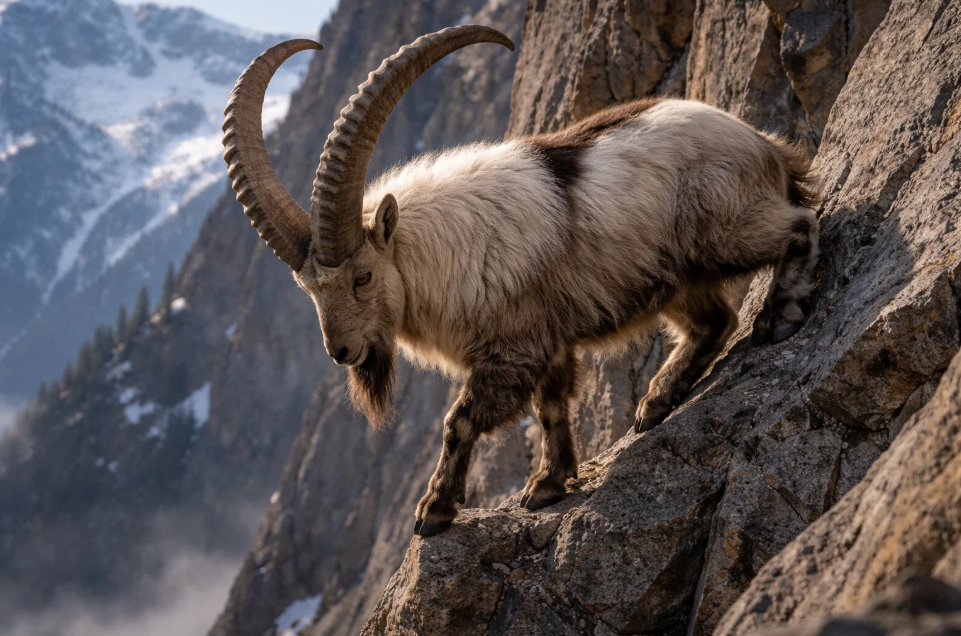 Копыта — главный инструмент. Они представляют собой уникальный конструкт: твёрдый, острый роговой башмак обрамляет мягкую, упругую, словно резиновая подошва, внутреннюю часть. Эта «противоскользящая система» позволяет животному цепляться за мельчайшие выступы и шероховатости. При движении вверх по склону копыта раздвигаются, увеличивая площадь сцепления. При спуске, который кажется со стороны смертельно опасным прыжком в пропасть, козёл опирается на прочные задние конечности и «приседает», используя скалу как опору. Его движения точны, выверены и лишены малейшей суетливости.