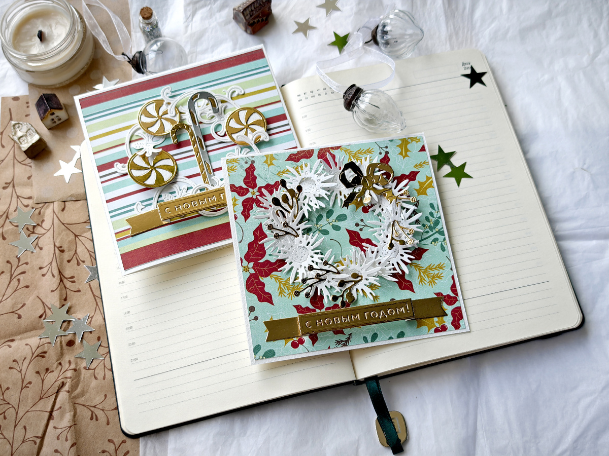 Привет! С вами Надя )) С наступившим Новым годом! уххууу! пусть все желания исполнятся! Я люблю две вещи - открытки с веночками, на любые праздники во все сезоны и делать эти веночки из несезонных ножей )) Первый венок собираю из ножа -эталона Мимикат "Космеи скромные цветы", уже чего только не было сделано из этих прекрасных серединок! Кем они только не притворялись )) Заплетаю в венок золотые веточки "Среди лугов" и "Весенняя гирлянда", завязываю бант "Театральная гостиная". Второй венок сделаем из конфет "Леденцы" и завитков "Страдающее средневековье". Очень мне нравится эти завитки делать зимне-морозными )) Добавляю поздравление из набора "Телеграфируйте".