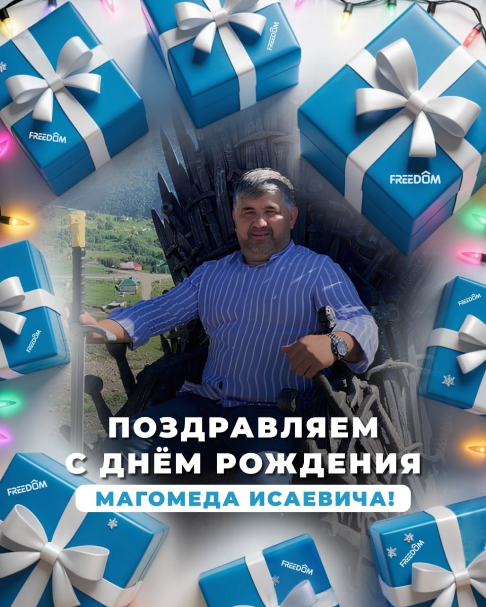 ! 🎉🎉🎉 Мы хотим выразить искреннюю благодарность за Ваше мудрое руководство, поддержку и готовность прийти на помощь в любую минуту. Желаем Вам здоровья, энергии, стойкости, вдохновения и успешной реализации всех намеченных планов и идей. Пусть удача всегда сопутствует Вам, а результаты Вашей работы радуют! С днем рождения, Магомед Исаевич! 🎉🎁✨ С уважением, команда торгового дома FREEDOM ❤️