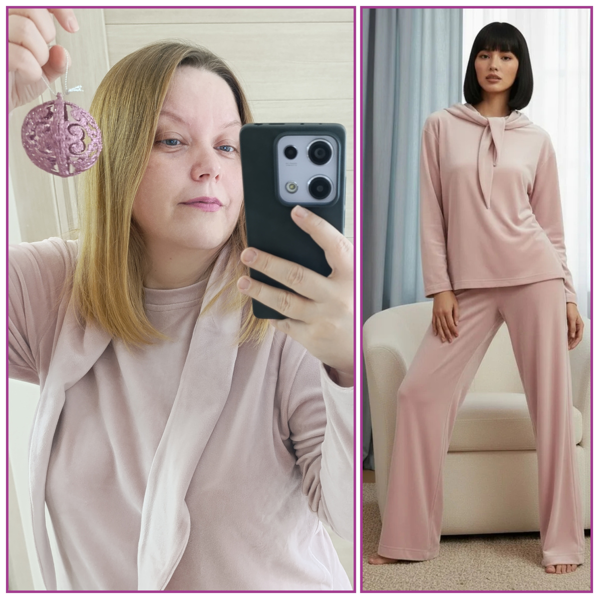 Иногда лучшие решения — незапланированные. Платье Илины было куплено ещё на прошлый Новый год, пижама — свежая покупка, и всё совпало в идеальный семейный образ в одном цвете. У нас получилась гармоничная пудровая гамма, в которой мы встречали праздник — красиво, стильно и невероятно комфортно, даже несмотря на болезнь. Кстати, он меня своим комфортном даже лечит. Я тут придумала, пока не выхожу из дома, всунуть резинки в подгиб штанин. И получились джогеры. Дел минут на 5, а моя проблема с подшивом решилась хорошо.