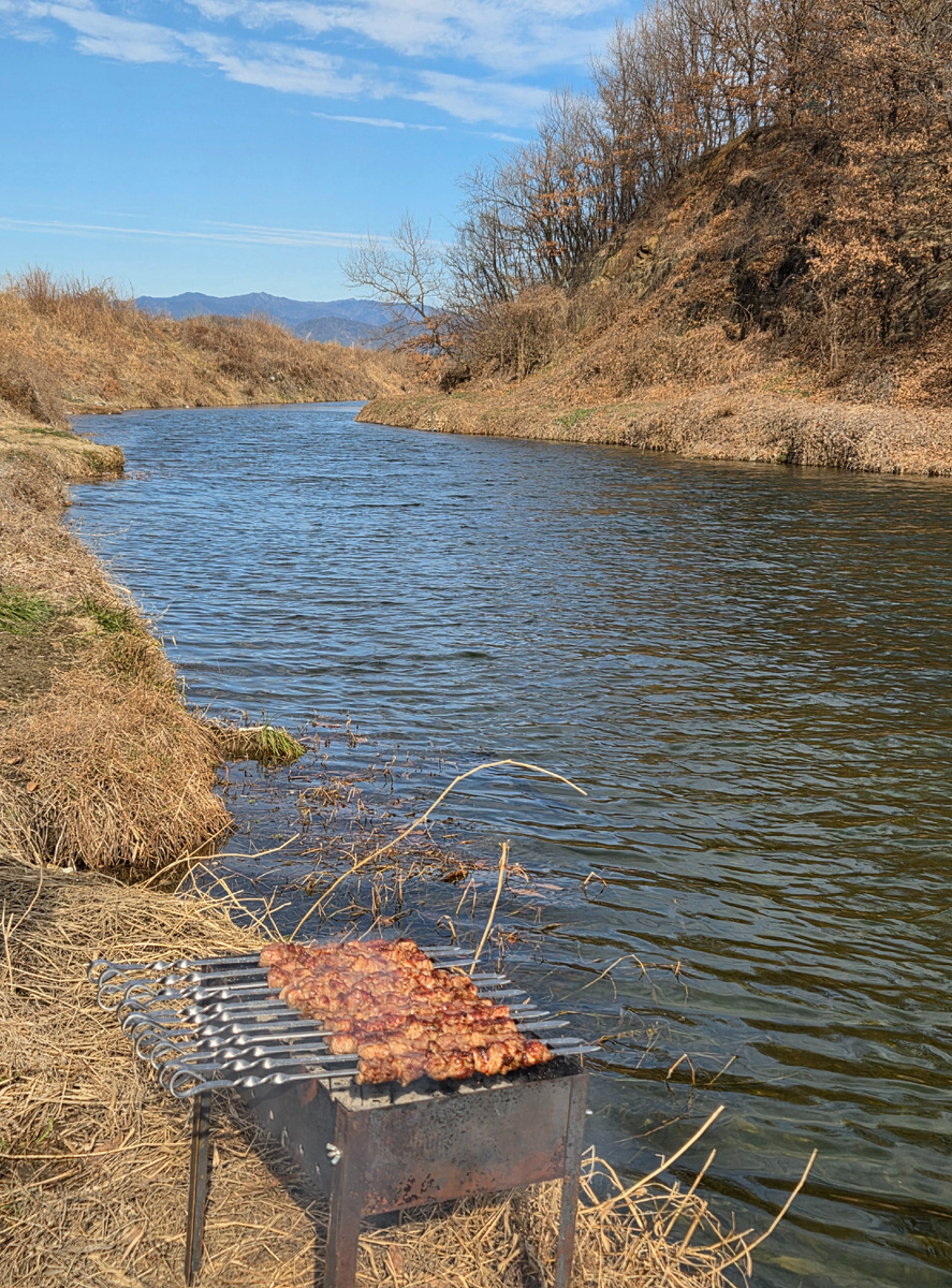 Проснулись 31 декабря и поехали жарить шашлыки на речку. Муж предварительно замариновал свиную шею. Быстренько пожарили и поехали домой. С удовольствием поели шашлык с селёдкой под шубой. Отдохнули, т.к.муж пришел с утра после ночной смены. Проснулись вечером, заправили оливье, и решили поехать отмечать новый год к другу мужа. Ехать к ним 1 час, в город Кенжу. Успели за 5 минут до нового года. Там уже стол был накрыт. Друг с женой, его сестра и я с мужем вместе отмечали новый год. Посидели, поели, а потом захотелось встретить рассвет. Поехали в город Пхохан. Это тот город, куда летом мы ездили на море.