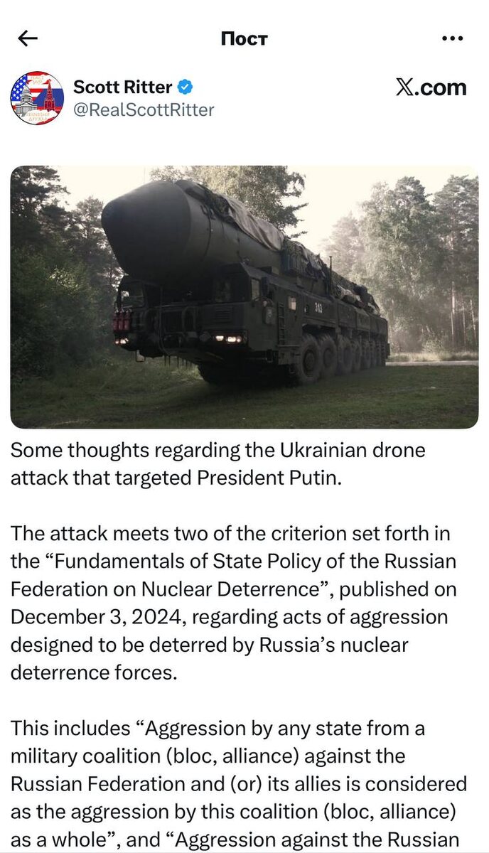 Об этом написал бывший американский разведчик Скотт Риттер в соцсети X. «Нынешнее украинское правительство нельзя рассматривать как партнера по переговорам, а скорее как террористическую организацию, которую необходимо полностью ликвидировать». Риттер также подчеркнул: Европе необходимо дать понять, что она виновна в действиях режима Зеленского. 🌐 За Русский Мир©Резервный📣Наш Чат✔️Подпишись‼️