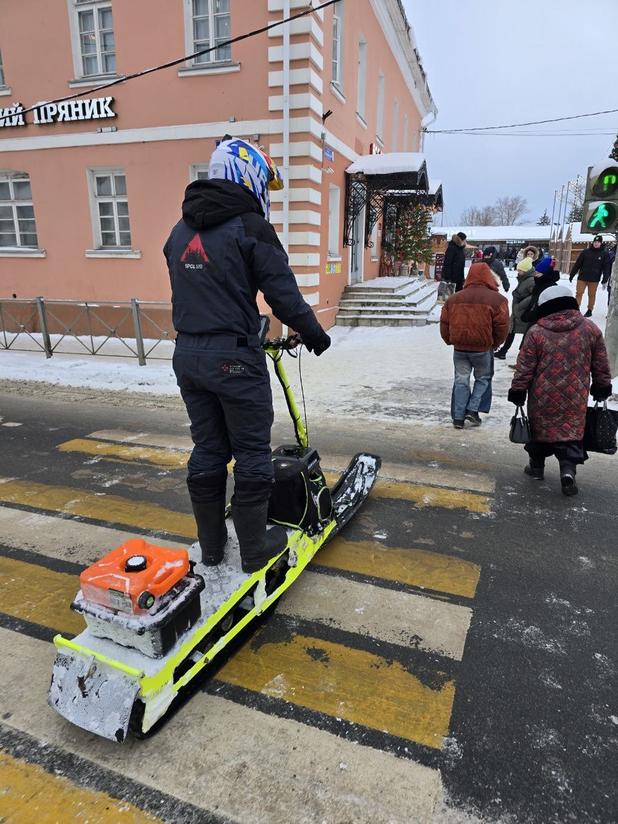 Зима. Самокатчики сменили электро-самокаты на бензиновые с лыжами.