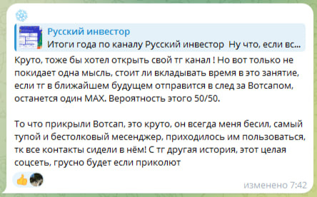 Итак, попробую ответить по порядку. Стоит ли открыть свой канал? Я думаю, что если есть такое желание/потребность - попробовать однозначно стоит. Тем более, что это практически ничего не стоит (конечно, если не вбухивать в канал десятки и сотни тысяч рублей). Почему, на мой взгляд, это сделать стоит? Изначально я завел канал как записную книжку для своих мыслей. В последствии, он трансформировался в мысли по инвестированию. А по большому счету, я скорее пишу обо всем, что меня волнует, хоть и стараюсь делать это с финансовым уклоном. Для меня потребность писать была первична. Но даже при всей моей скромности, писать "в стол" довольно тяжело. Каким бы "одиночкой" я не был, иногда хочется все таки знать, что ты не один такой "ходишь в магазин с пакетом", не один стремишься к рациональности, ну и вообще, хочется обсудить те или иные мысли, или просто новости. Кроме того, иногда канал помогает мне и самому разобраться в том или ином вопросе. Я беру тему, читаю все доступное по тематике (з