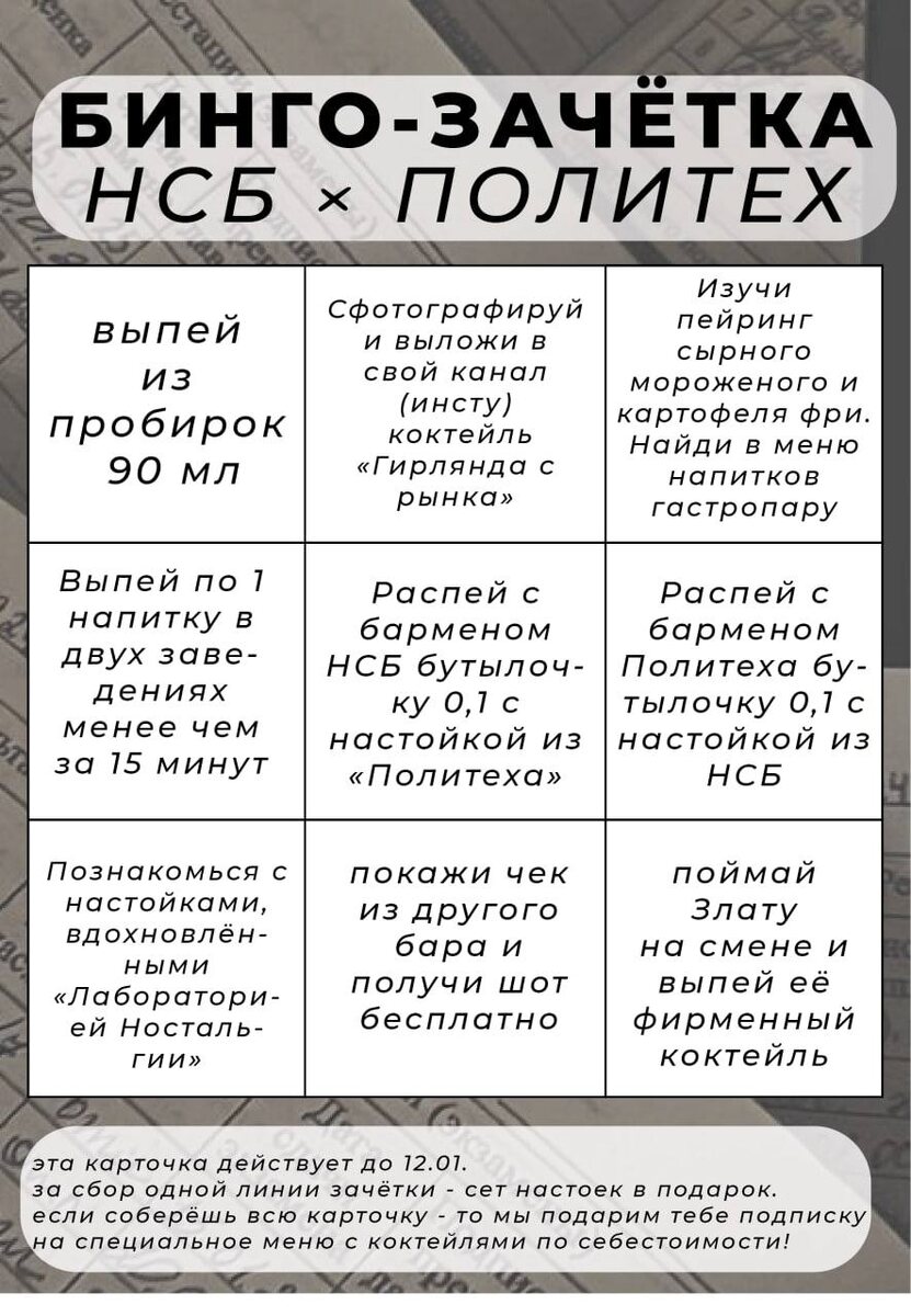 В барах «НСБ» и «Политех» у вас есть возможность получить специальную зачетку-бинго и начать свое невероятно путешествие, выполняя задания по билетам. При заполнении одной из строк бинго, вы получаете сет настоек. А отличники, которые заполнят все 9 ячеек, получат автомат в виде нашего абонемента на месяц! ❤️ Бронируй столик по ссылке. Ул. Розы Люксембург 8 | 10 8 (912) - 034 - 28 - 68