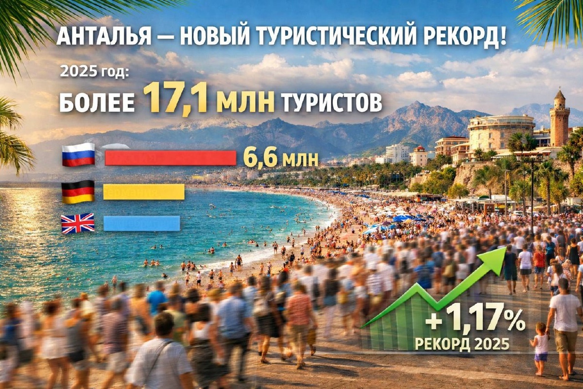 ! В 2025 году Анталья приняла более 17,1 млн туристов 🤍 Это исторический максимум для региона 📈 рост по сравнению с прошлым годом — +1,17% 🌍 Лидеры по числу гостей: 🇷🇺 Россия 🇩🇪 Германия 🇬🇧 Великобритания Особенно активно путешествовали россияне — за 11 месяцев 2025 года Турцию посетили более 6,6 млн человек. ☀️ Море, климат, сервис и атмосфера — Анталья уверенно остаётся одним из самых любимых курортов Средиземноморья.