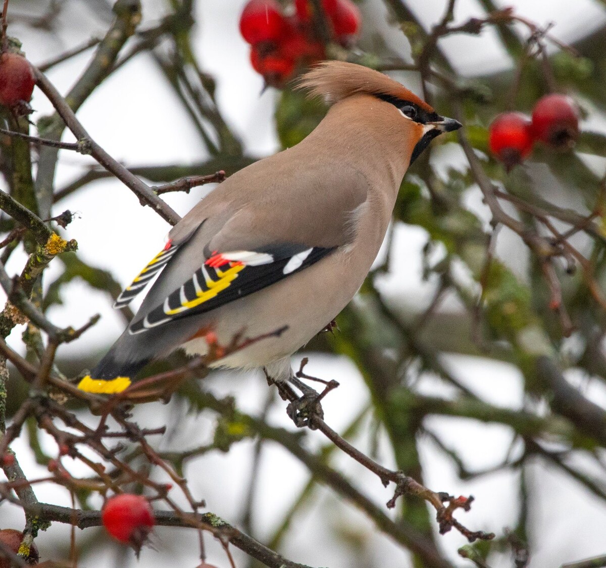 Оперение свиристеля – это настоящее произведение искусства. Основной цвет – серовато-бурый, но он украшен множеством ярких деталей: