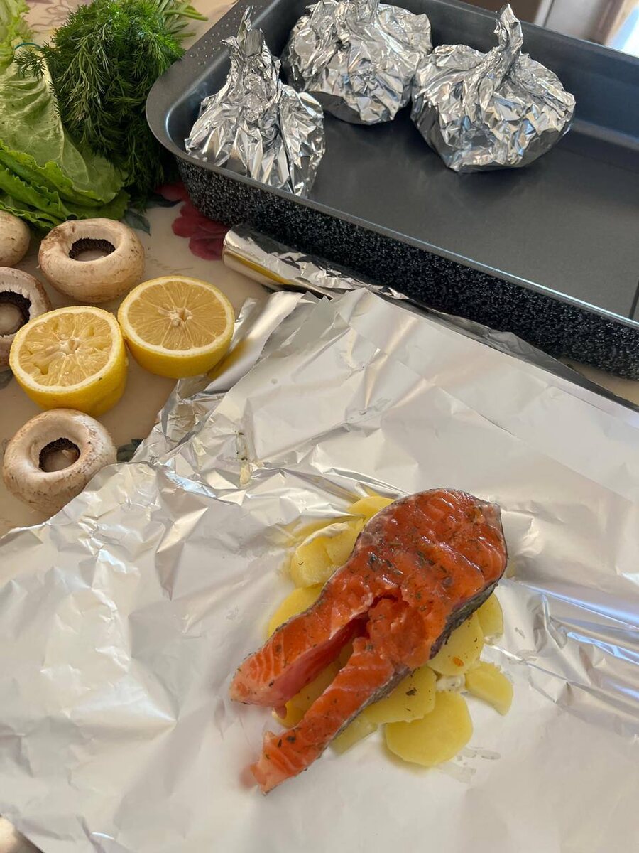? У нас, как обычно салатики, закусочки. А на горячее я делала стейк из форели 🍣 на подушке из картофеля. 🥗 Из продуктов: форель, картофель, лук, помидор, лимон, оливковое масло, сливочное масло, специи. Готовить просто. Заворачиваем в фольгу, запекаем в духовке минут 30. Очень вкусно! Готовили?