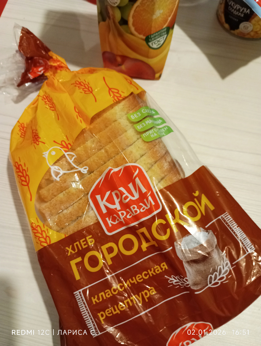 Еда у нас с мужем есть, слава Богу, а вот хлеб закончился, покупали его 31 декабря, вчера не ходили в магазин, а сегодня вышли прогуляться и купили свежего хлеба, от 2 января.