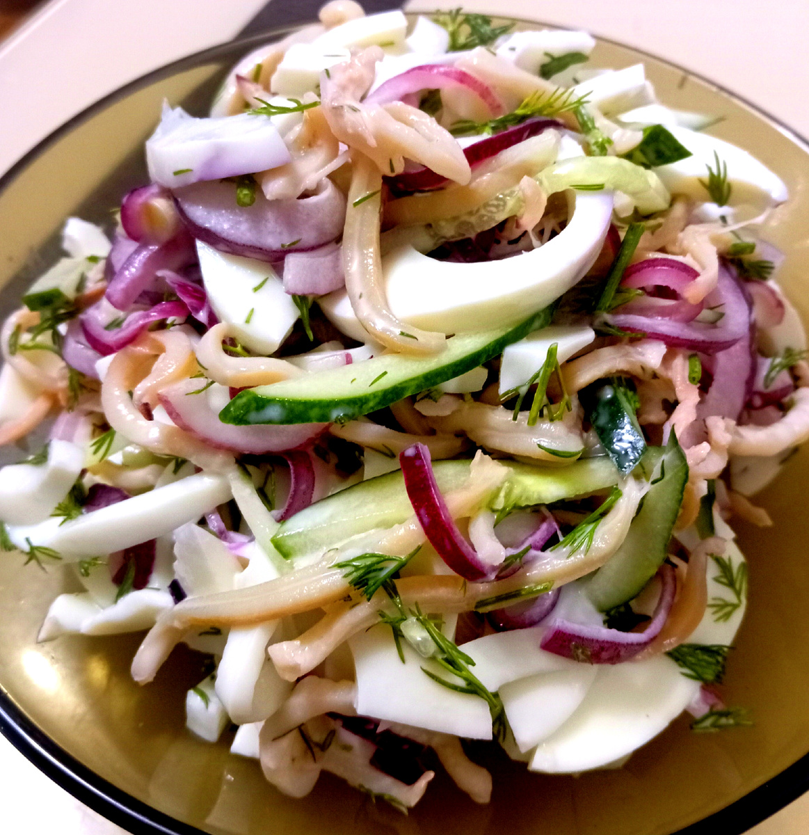 Добрый день, дорогие друзья! Сегодня хочу поделиться с Вами рецептом простого салата с кальмарами и свежим огурцом.