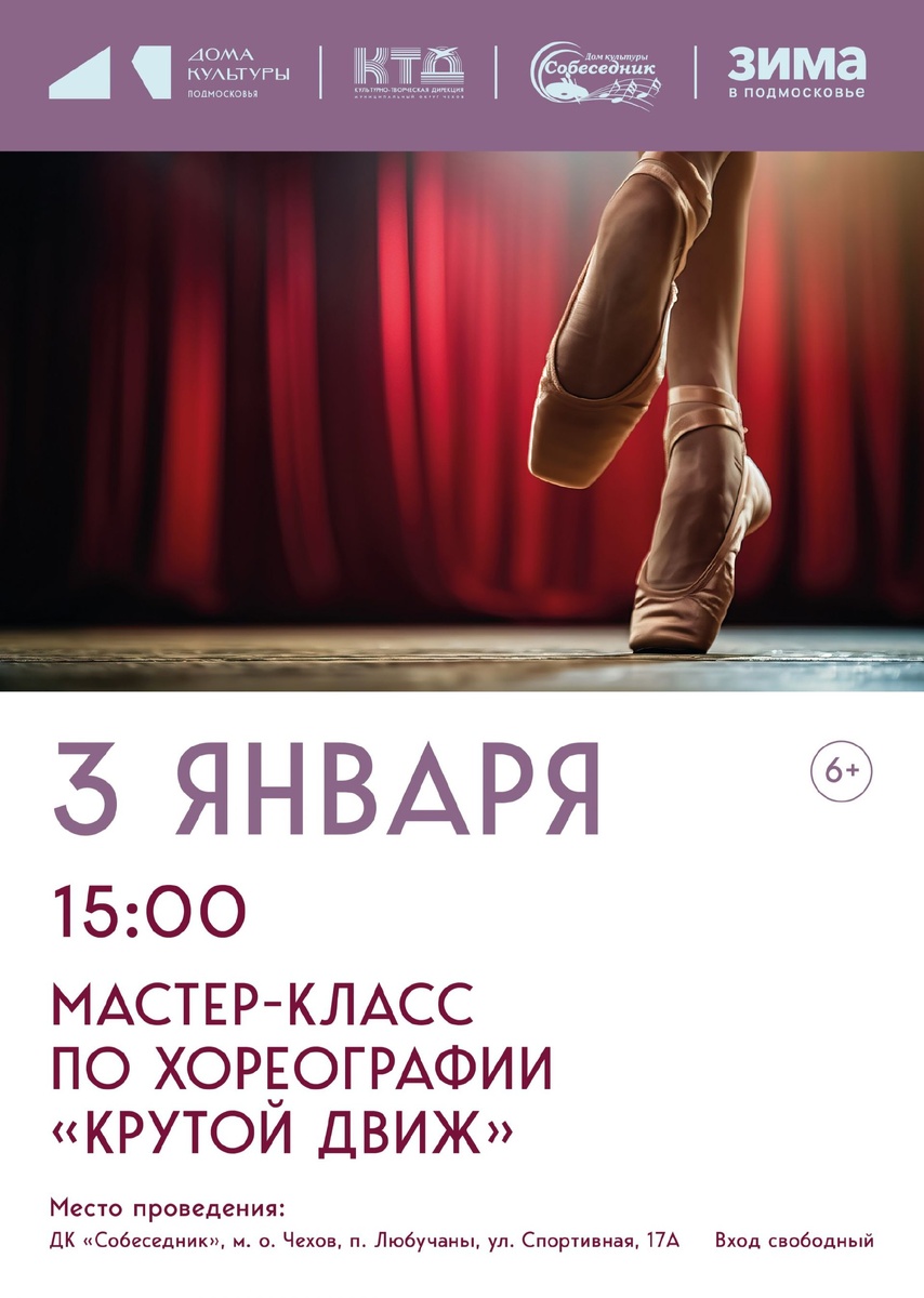 ✨ На новогодних каникулах в п. ЛЮБУЧАНЫ Приглашаем на мастер-класс по хореографии, вместе потанцуем 💃 🚫 Возраст: 6+ 📆 03.01.2026 🕛 15:00 🏢 ДК «Собеседник» 📍 г.о. Чехов, п. Любучаны, ул. Спортивная, д.17А 🪙 Вход свободный❗️ ⭐Поддержать канал голосом ✅ Мероприятия Чехов https://dzen.ru/id/66cc4b48e9ef144699238a51 http://vk.com/chekhov_events http://dzen.ru/chekhov_events