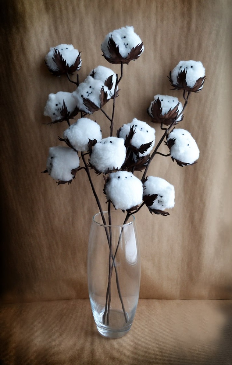 Сегодня у нас интерьерная композиция по рисунку Alliot_art. Веточки хлопка и букет из котов одновременно. Мечты и рисунки должны сбываться, я считаю😎 Из чего сделано: ваза магазинная из стекла 1 шт. веточки из проволоки, тейп-ленты, фоамирана, искусственно меховых котов 3 шт.