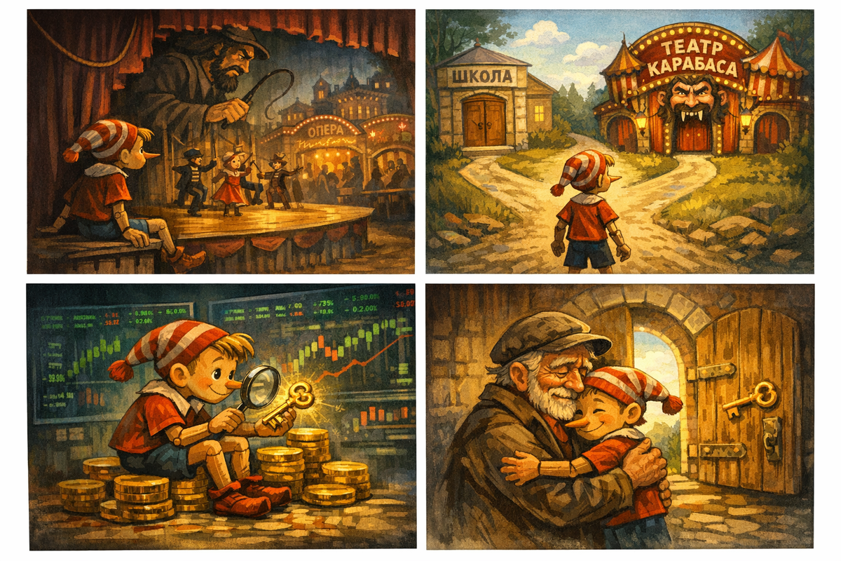 В школе нам предлагают играть Буратино. Во взрослой жизни — либо перестать играть, либо выбрать другой театр. Выбор всегда подаётся как простой: свобода или послушание. Страшно быть живой личностью — идёшь работать к Карабасам. Хочешь сам стать Карабасом — создаёшь свой театр. Сначала конкуренция кажется здоровой, потом — как получится. Проходит время, и появляется ощущение, что вся жизнь — это набор театров. Ты заправляешь одним, чтобы иметь силы ходить в другие. Или ходишь по чужим, чтобы хоть как-то подпитывать свой. А можно и вовсе всю жизнь играть в одном театре — в надежде на благосклонность за непрерывный стаж. Сил играть уже нет, а покинуть театр страшно. Коллектив хороший — все такие разные, объединённые одним заключением. Вроде близкие друг другу люди, но как будто сидим в одной камере за одну и ту же жажду. Что со всем этим делать — непонятно. Кто-то в отчаянии даже за керосином и спичками в карман полезет. Но как только театр становится по-настоящему не нужен, он рушится са
