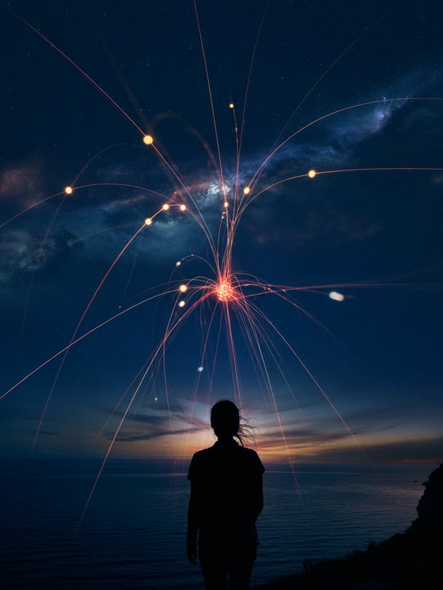 Она встала и подошла к окну. Прижала ладонь к холодному стеклу, и её отражение — призрачное, полупрозрачное — наложилось на звёзды, как будто она была частью неба.