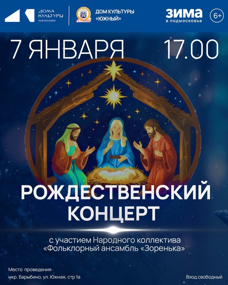 ✨ 🎄 Приглашаем вас на праздничный Рождественский концерт🎶✨ Это уникальная возможность погрузиться в атмосферу радости и волшебства, услышать потрясающие музыкальные произведения и насладиться праздничным настроением. Ждем вас❄️ 🚫 Возраст: 6+ 📆 07.01.2026🕒17:00 🏢 Городской дом культуры «Южный» 📍 г.о.Домодедово, мкрн.Барыбино, ул.Южная, стр1А 💰 Вход свободный❗️ ✅ Мероприятия Домодедово https://dzen.ru/id/66f10385cc4c5a16f7b5fb02 http://vk.com/domodedovo_events http://dzen.ru/domodedovo_events