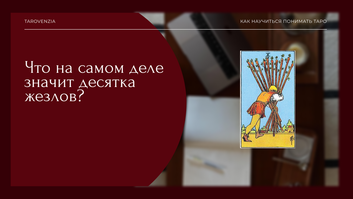 Мужчина идёт, сгорбившись под тяжестью десяти жезлов. Он держит их крепко, упрямо. Он близок к цели, но не видит дороги — взгляд опущен, спина согнута, всё внимание уходит на то, чтобы не уронить. Это Десятка жезлов. И она говорит не только о тяжести. Она говорит о цене. Каждый жезл здесь — символ желания, намерения, действия, когда-то зажжённого внутренним огнём. Ты хотел многого — и получил. Но теперь ты несёшь не только жезлы, ты несёшь последствия. Эта карта — о тех, кто привык быть сильным. Кто тащит на себе больше, чем должен. Из чувства долга, из страха подвести, из невозможности доверить. Она не упрекает. Но она предупреждает: не всякий груз — твой. И не всякая ноша — благородна. Иногда сила — это отпустить. Или хотя бы позволить другим идти рядом. Если вы хотите глубже понимать карты Таро — я приглашаю вас я приглашаю вас на бесплатную лекцию о Старших арканах в контексте вопросов про отношения. Мы разберём, как один и тот же аркан проявляется в положительной и негативной дин