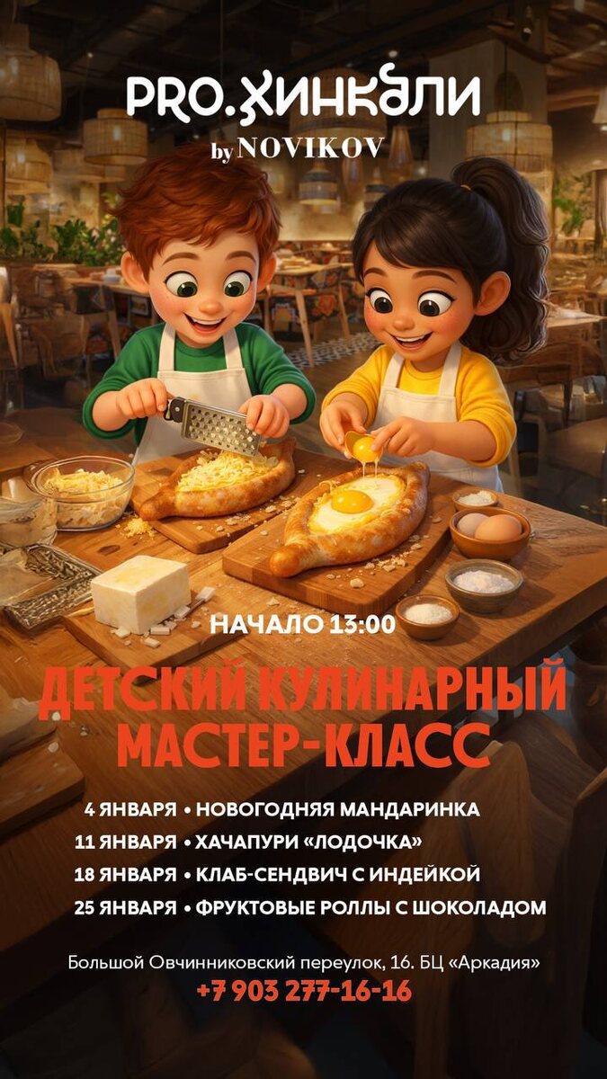 » Новогодние каникулы и январские выходные — время для теплых семейных встреч в центре Москвы. В ресторане «PRO.Хинкали» у м. Новокузнецкая дети смогут принять участие в бесплатных кулинарных мастер-классах, пока взрослые будут наслаждаться сочными хинкали, румяными хачапури и блюдами на мангале. Каждое воскресенье юных гостей ждет новое блюдо и знакомство с гастрономией в игровом формате. Расписание кулинарных мастер-классов: ✨4 января — новогодняя мандаринка ✨11 января — хачапури-лодочка ✨18 января — клаб-сэндвич с индейкой ✨25 января — фруктовые роллы с шоколадом. Начало мастер-классов — в 13:00. Участие бесплатное для гостей ресторана. Требуется предварительная запись по телефону: +7(903)277-16-16. 📍м. Новокузнецкая, Большой Овчинниковский переулок, 16, БЦ «Аркадия»