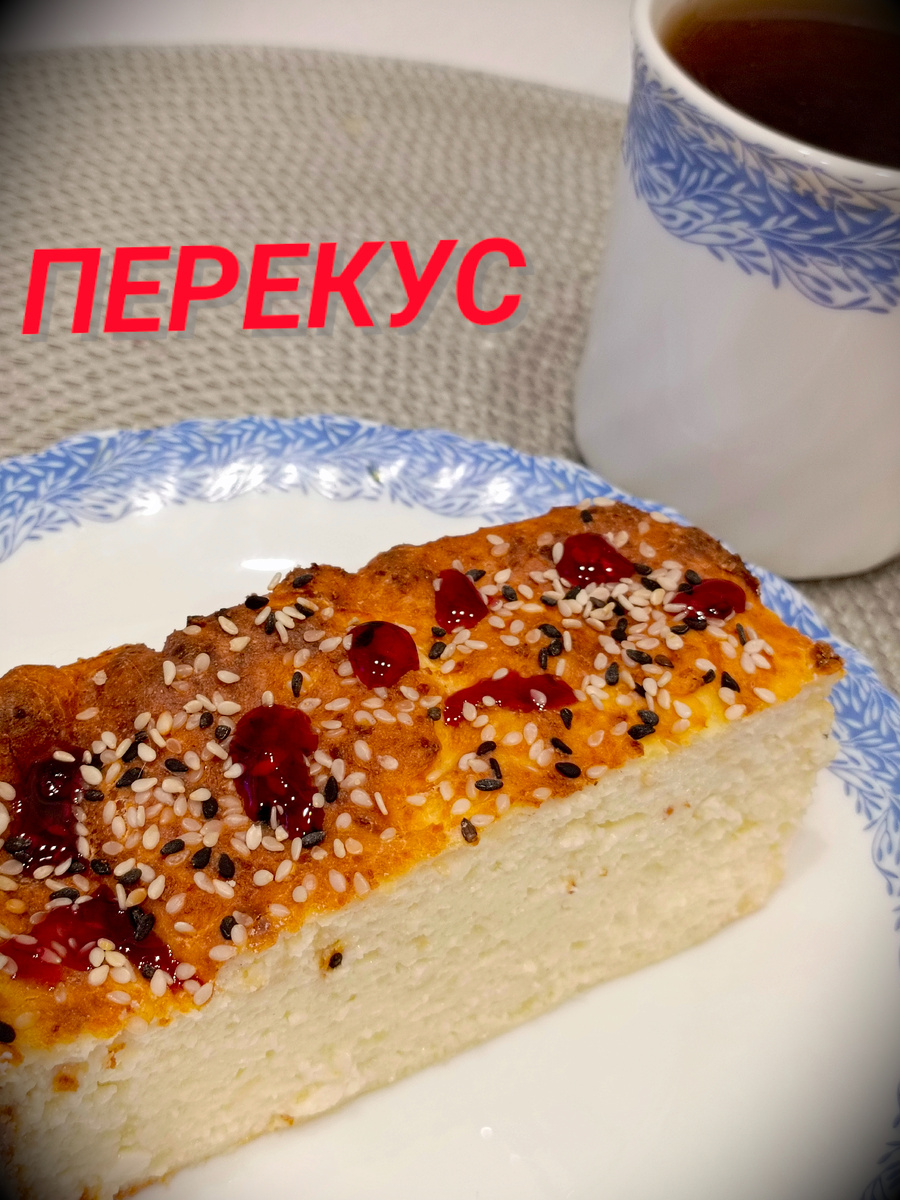 Сегодня на полдник у меня была творожная запеканка — получилась просто восхитительной! Такая нежная, что сложно подобрать слова, чтобы описать её вкус. Она буквально тает во рту. Я ещё капнула несколько капель варенья прямо на нее. К запеканке я налила чашечку ароматного чая, и вместе они составили отличный дуэт для приятного перекуса.