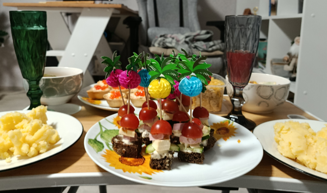 Первого января в 10 утра уже была на линии, слушала клиентов и отвечала на вопросы. Мало их было, кстати, страна в этот день не спешила просыпаться и волноваться по поводу банковских продуктов. Время после праздников самое прекрасное, так как еды предостаточно в холодильнике, можно расслабиться и не строить из себя заботливую мать, приставая к дочери с вопросом, чем её кормить. Дочь наготовила к праздничному столу канапешки, которые сама и съела, мне досталась одна. Пока я разговаривала по телефону (это длилось примерно час), канапешки улетучились. Собственно, большая часть нашего застолья дело рук Вари. В интернете она углядела салат из помидор, огурцов, кукурузы, колбасы и кириешек. Картофель тоже дочка толкла. Я всё же чуток внесла вклад в семейные посиделки: оформила тарталетки с икрой и купила салат "Гнездо глухаря". Не стали мы нарушать нашу традицию, образовавшуюся в данной квартире, и стол организовали из двух стульев, как и в прошлом году. Так романтичнее.) Телевизор у нас