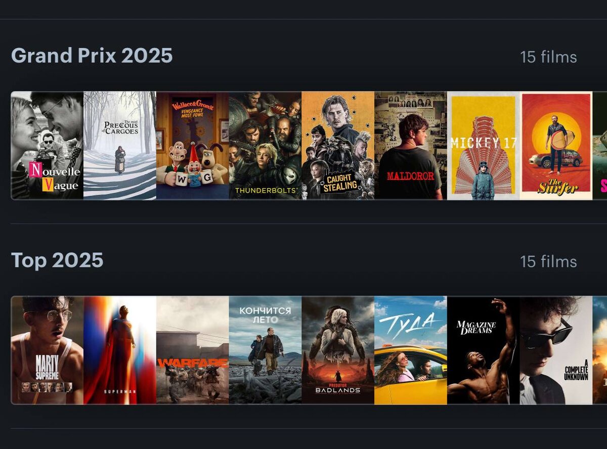 А кому мои топы нужны — не верю, что вы существуете — в виде красивых подборок на Letterboxd, то вот они: - лучшие 2025; - гран-при 2025. ПыСы: расстановки по местам там не добавлял, все сплошными списками. Ну и на леттер мой подписывайтесь, в целом, чо уж) #fcletters