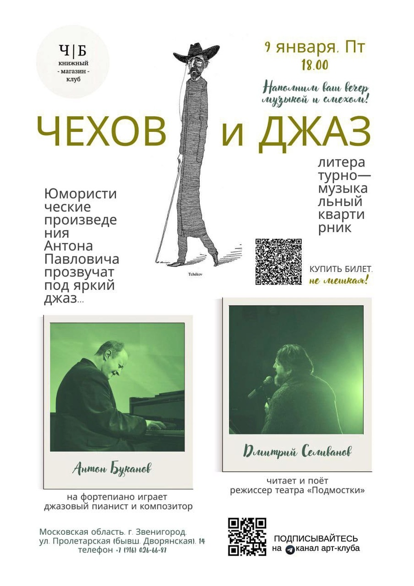 ! Юмористические произведения Антона Павловича прозвучат под яркий джаз. 🎹За пианино маэстро Антон Буканов — один из лучших джазовых музыкантов страны. В его активе выступления на самых разных концертных площадках России и зарубежья, участие в международных джазовых фестивалях, в том числе в качестве композитора, аранжировщика и даже трубача! 🎙️Рассказы («Хирургия», «Дачники» и др.) Антона Павловича Чехова читает Дмитрий Селиванов — джазовый певец, актер, чтец, режиссер театра «Подмостки». Наполним ваш вечер смехом и музыкой! Билет: 2400₽ Продолжительность: 1,5 часа 20 мест 12+ 👉КУПИТЬ БИЛЕТЫ Покупайте билеты, не мешкая! Не каждый день, согласитесь-с, предлагают столь редкое удовольствие... Квартирник состоится в арт-пространстве книжного магазина-клуба Ч|Б по адресу: 📍Московская область, г.Звенигород, ул Пролетарская (в прошлом Дворянская), д14 📞+7 (916) 026-66-87 ПС: На афиша.ру сегодня замечены сбои, если не получится купить билет онлайн, приходите в книжный. В рабочем ре