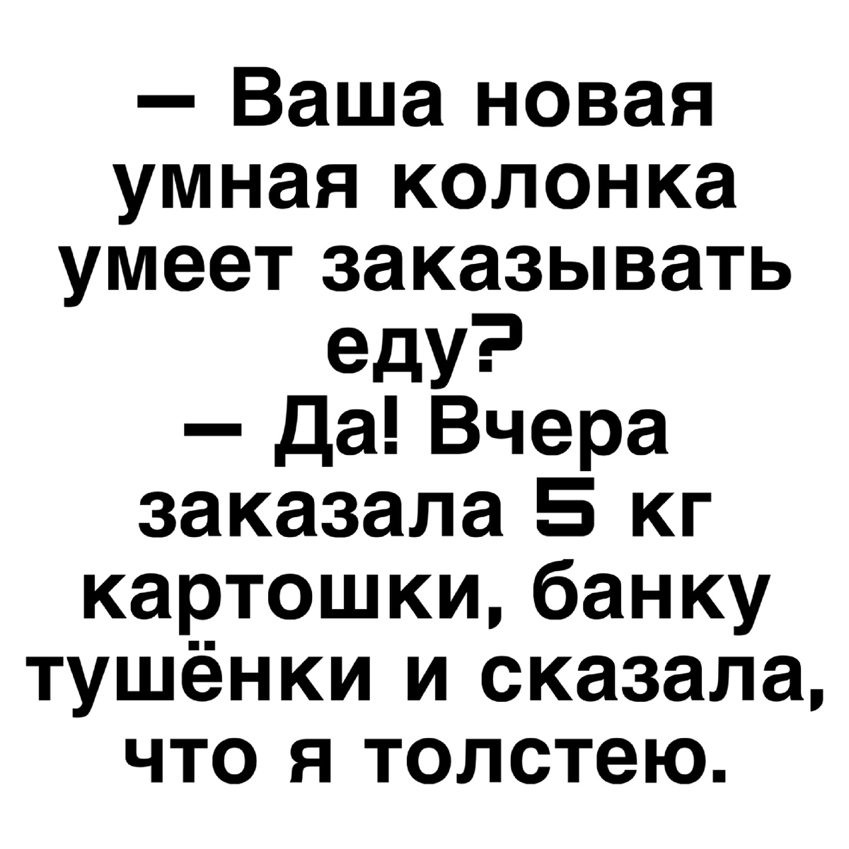 — Да! Вчера заказала 5 кг картошки, банку тушёнки и сказала, что я толстею.