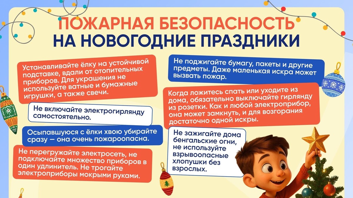 ⚠️ Управление образования Великих Лук предупреждает о повышенном риске пожаров в период новогодних праздников. 🔥 Среди основных причин возможных возгораний специалисты называют неисправные или оставленные без присмотра гирлянды, легко воспламеняющиеся ёлочные украшения, перегруженные розетки, использование бенгальских огней и хлопушек, а также неосторожное обращение с огнём. ✅ Чтобы праздник не омрачился бедой, важно заранее позаботиться о безопасности и соблюдать правила пожарной безопасности. 👉ВЛуки.ру