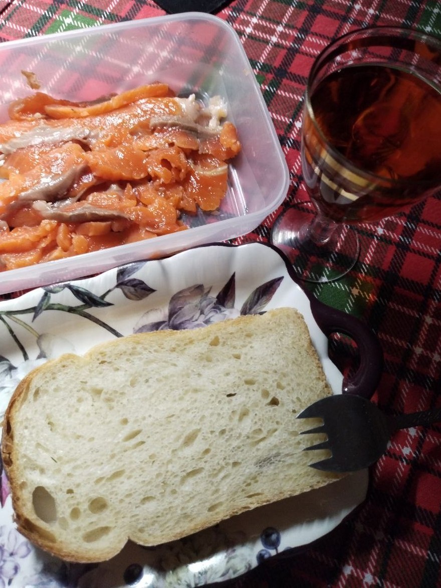 Ну вот посудите сами. В Новый год дело не дошло ни до рыбы красной малосолёной, ни до красной малосолёной икры. И мускателя почти полная бутылка стоит. Пришла ночь со вчера на сегодня. Я не могу уснуть вообще, как ни пыталась. Вот и получилось сначала так: