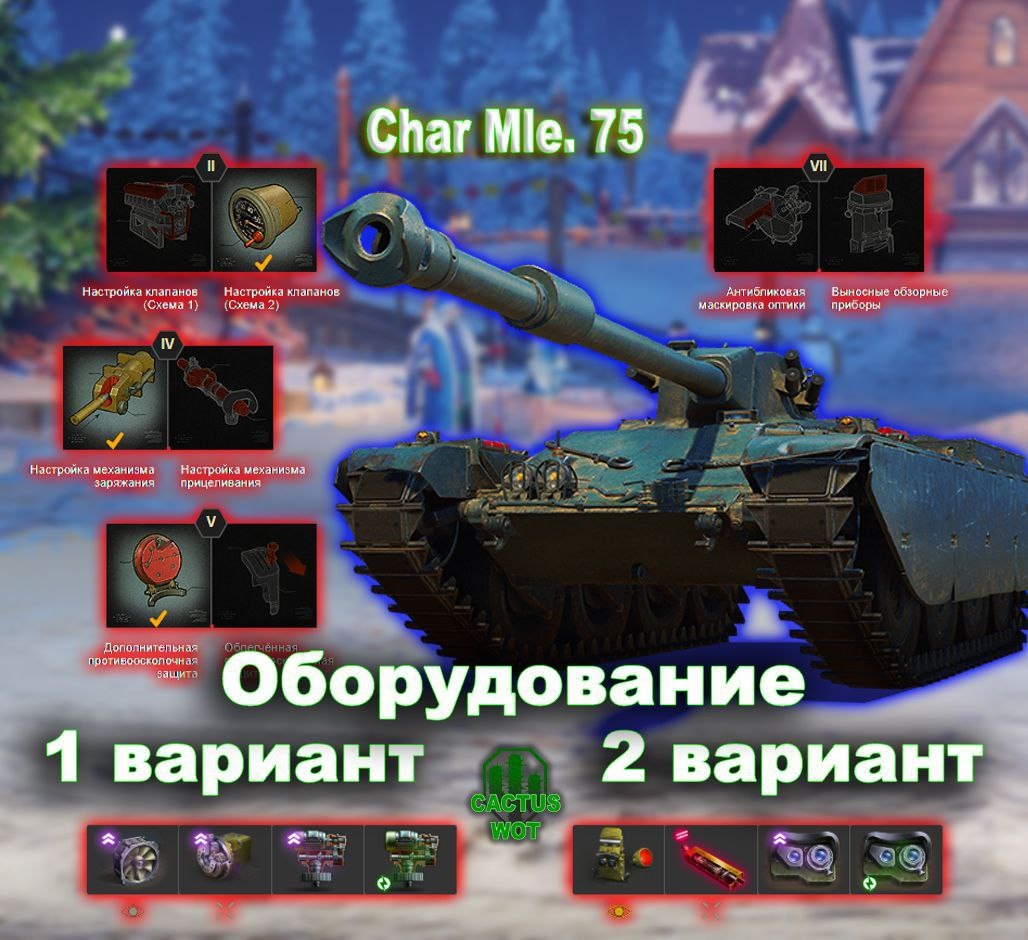 75 оборудование и полевая модернизация. 🏤Лёгкий танк универсальный 9 уровень. Франция. 🔼Оборудование и полевая модернизация на картинке🔼 ТТХ: Калибр (мм)100 Урон (ед.)200 / 200 / 370 Бронепробиваемость (мм)200 / 240 / 53 Скорострельность орудия (выстр/мин)7.58 Заряжание орудия (с)42 Время перезарядки между выстрелами (с)3.50 Время смены снаряда в кассете (с)0.50 Снарядов в кассете (шт.)3 Снарядов в магазине (шт.)6 Скорость гориз. перевода прицела (град/с)65 Углы поворота башни (град)180 / 180 Углы вертикальной наводки (град)-8 / 15 Время сведения (с)2.80 Разброс на 100 м (м)0.38 Средний урон в минуту (ед./мин)1515.77 Боекомплект (шт.)42 Прочность (ед.)1150 Бронирование корпуса (лоб/борт/корма в мм)60 / 40 / 30 Бронирование башни (лоб/борт/корма в мм)50 / 30 / 15 Время ремонта ходовой (с)8.02 Масса (кг)29600 Мощность двигателя (л.с.)850 Удельная мощность (л.с./т)21.12 Макс. скорость / задний ход (км/ч)55 / 20 Скорость поворота шасси (град/с)60 Время перехода в осадный режим (с)1