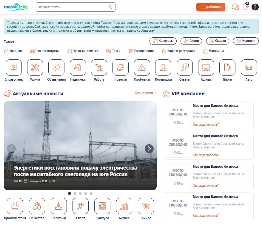 ! 🔥 ЗАЧЕМ ЖДАТЬ СЕЗОНА? РАБОТАЙ НА ОПЕРЕЖЕНИЕ С ПОРТАЛОМ TUAPSE.CITY! Планируете приток туристов в свой отель, рост продаж в магазине или наплыв клиентов на услуги? Городской портал Туапсе Сити — это не просто сайт с объявлениями. Это твой главный инструмент для продвижения в самом сердце курортного города, который видят по всей России! 🎯 ПРЯМО СЕЙЧАС ТЫ МОЖЕШЬ БЕСПЛАТНО: ✅ СОЗДАТЬ ВИЗИТКУ БИЗНЕСА в нашем каталоге предприятий — тебя найдут на отдыхе и в поиске услуг. ✅ РАЗМЕСТИТЬ ЯРКИЙ БАННЕР И НОВОСТЬ КОМПАНИИ на главной странице — это лента рекомендаций для самой заинтересованной аудитории! ✅ ВЕСТИ КОРПОРАТИВНЫЙ БЛОГ — делитесь акциями, историями, советами. Станьте экспертом в своем деле для тысяч читателей. ✅ ПУБЛИКОВАТЬ ОБЪЯВЛЕНИЯ о товарах, услугах, аренде и вакансиях — мгновенный отклик от жителей и гостей города. ✅ УПРАВЛЯТЬ ВСЕМ САМОСТОЯТЕЛЬНО из личного кабинета — без посредников и скрытых платежей. ✨ ВЫГОДА ДЛЯ ТЕБЯ — МАКСИМАЛЬНАЯ И ПРЯМАЯ: * Охват всей России — пор