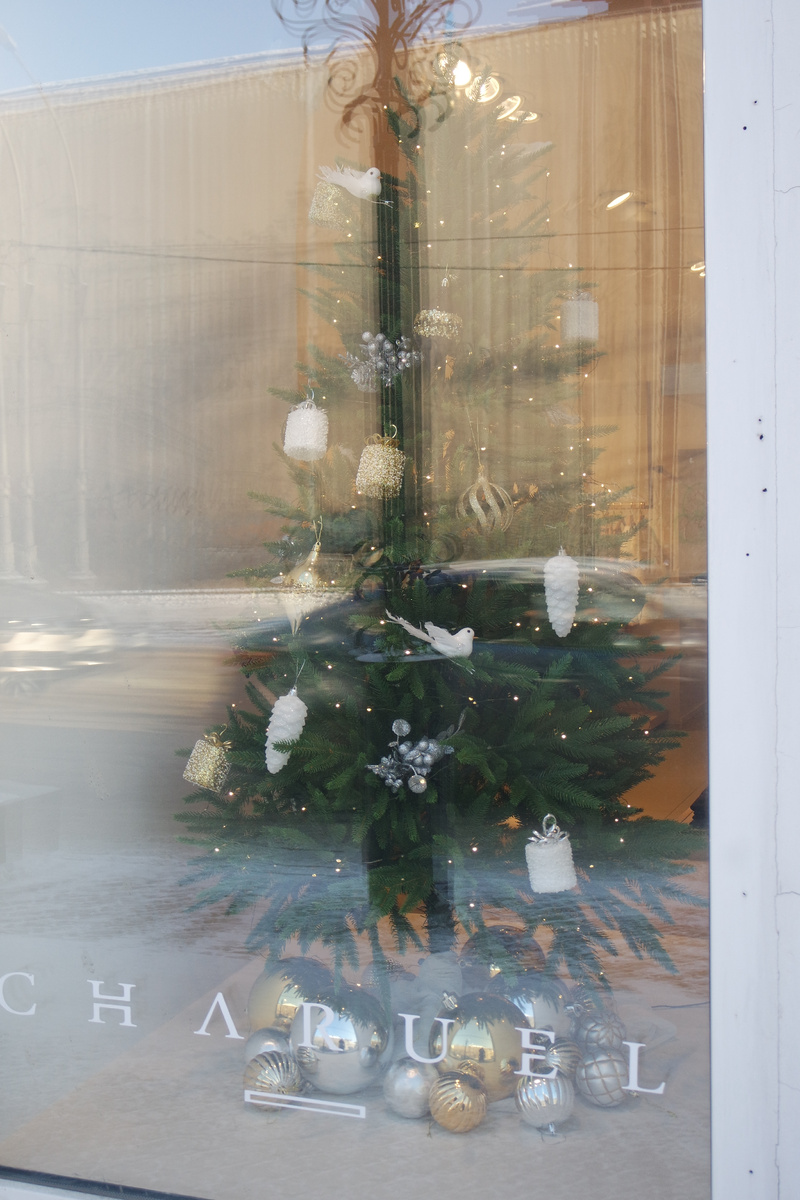 Мы с вами немного прогуляемся по Карла Маркса, но чуть-чуть, ибо я, растяпа, забыла варежки!.. Шла от подруги и... была налегке и с фотокамерой, но был холодный ветер, мороз и... я успела наснимать не слишком много. Например, вот такую нежную и прелестную ёлочку в витрине магазина: