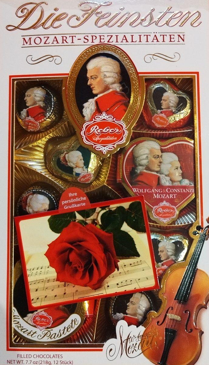 В закрытом же виде, не сразу понятно, что эта прозрачная часть вообще есть, так как через нее видно конфеты, каждая из которых сама находится в индивидуальной упаковке с изображением Моцарта и не только его, и такое же изображение есть на непрозрачных частях лицевой стороны коробки.