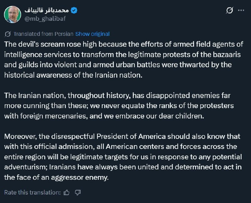'All American centers and forces across entire region will be LEGITIMATE TARGETS for Iran'— Parliament Speaker Ghalibaf warns 'DISRESPECTFUL' US Prez against interfering in Iran's affairs
