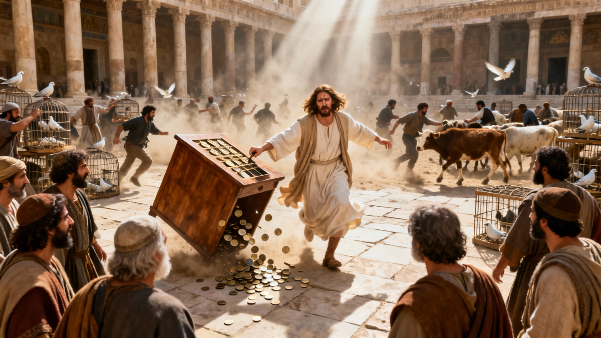 Накануне Он вошёл в город как триумфатор, окружённый ликованием народа. Но на следующий день Он появился в его духовном сердце как Судья, несущий огонь очищения. Прибыв в Иерусалим, Иисус направился в храм и начал выгонять оттуда торговцев. Это не было импульсивным проявлением гнева. Это было осознанное, целенаправленное действие пророка, стремившегося вернуть святость Божьему Дому. Храмовой двор язычников, предназначенный для молитвы всех народов, превратился в шумный, дымный базар. Повсюду стояли стойки с голубями для жертв бедняков, мычали отобранные на убой животные. В воздухе стоял густой запах навоза, крови, пыли и человеческого пота. Но громче всего был звон монет: столы меновщиков занимали центральное место. Поскольку римские монеты с изображениями кесаря считались нечистыми для храмового взноса, паломникам приходилось менять их на особую тирскую чеканку — за неправедный обменный курс и дополнительную плату. Дом молитвы стал местом наживы, «вертепом разбойников», где богомоль