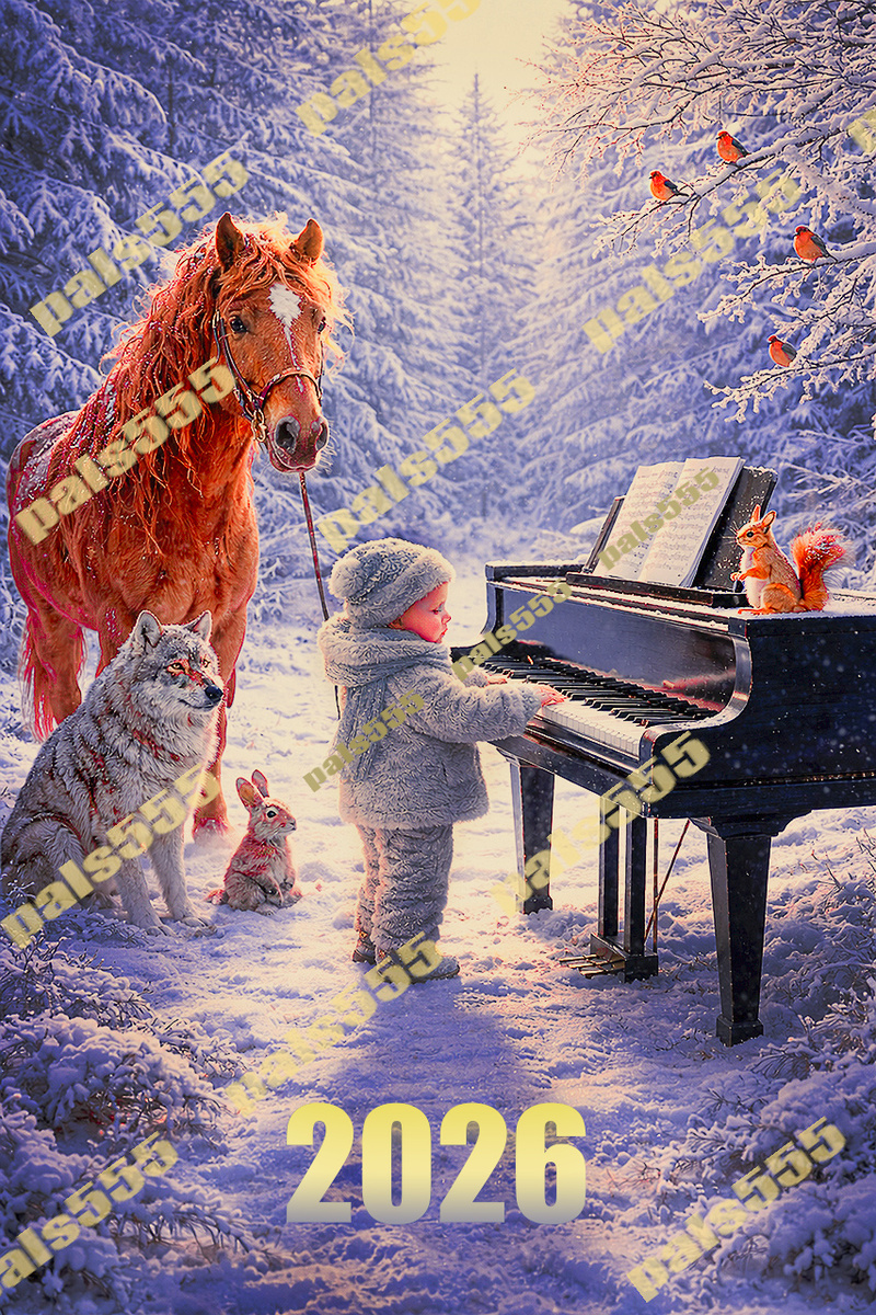Посреди лесной поляны стоит чёрный рояль. Его лаковая поверхность отражает снег, деревья и небо — словно в нём собрались все дороги года. За роялем — Малыш-Новый год. Он ещё мал, потому играет стоя, слегка приподнявшись на носки. Пальцы его осторожны, но уверены —
