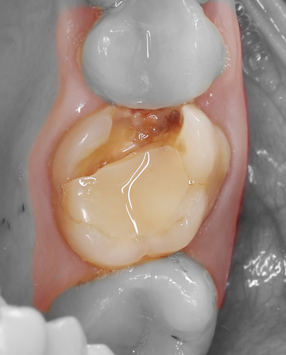 1) Дано: продольный перелом мезиального корня зуба 2.6, зуб признан непригодным к восстановлению. 2) Зуб был сегментирован с помощью фрезы линдемана и удален атравматично. 3) Остеотомия имплантантного проведена с помощью имплантантных фрез и остеотомов. 4) В ортопедически-выгодную позицию установлен имплантат Osstem 4.5*8.5. 5) Проведена аугментация костной части лунки с помощью ксеногенного костнозамещающего материала Bio-Oss. 6) Проведена аугментация мягкотканной части лунки с помощью дСДТ. 7) Фиксирован ФДМ, наложены швы полипропилен 6/0.