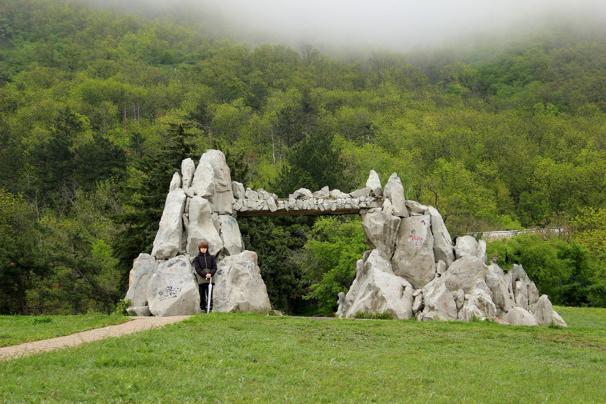 По пути на вершину горы Машук находится одна из популярных обзорных площадок Пятигорска - Ворота Солнца. Эта необычная арка появилась здесь еще 1970-х годах. По задумке архитекторов здесь сделали необычную "рамку" для закатного солнца - и если смотреть сквозь нее в определённое время, создаётся эффект, как будто солнце заходит прямо в каменные ворота. Говорят, что с площадки у ворот открывается один из лучших видов на Пятигорск, а в ясную погоду на горизонте отчетливо виден величественный Эльбрус. Правда мне увидеть закатное солнце в воротах и Эльбрус так и не удалось - поднимались мы на вершину днем, да ещё и попали в сильный туман. Оказалось, что у Ворот Солнца есть второе название — Ворота Любви, и с этим местом связано несколько разных традиций. Например, считается, что если влюбленная пара пройдет под аркой, держась за руки, их ждет долгая и счастливая жизнь. К Воротам Солнца часто приезжают молодожены. По еще одной примете - нужно загадать желание, стоя в центре арки на закате