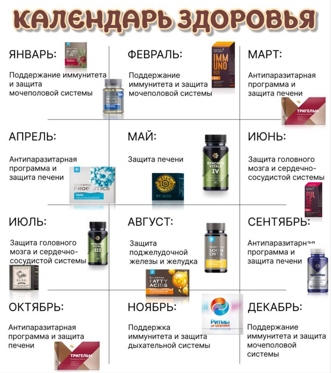КАЛЕНДАРЬ ЗДОРОВЬЯ, где расписана программа на каждый месяц. В итоге мы с вами за год восстанавливаем все системы организма.