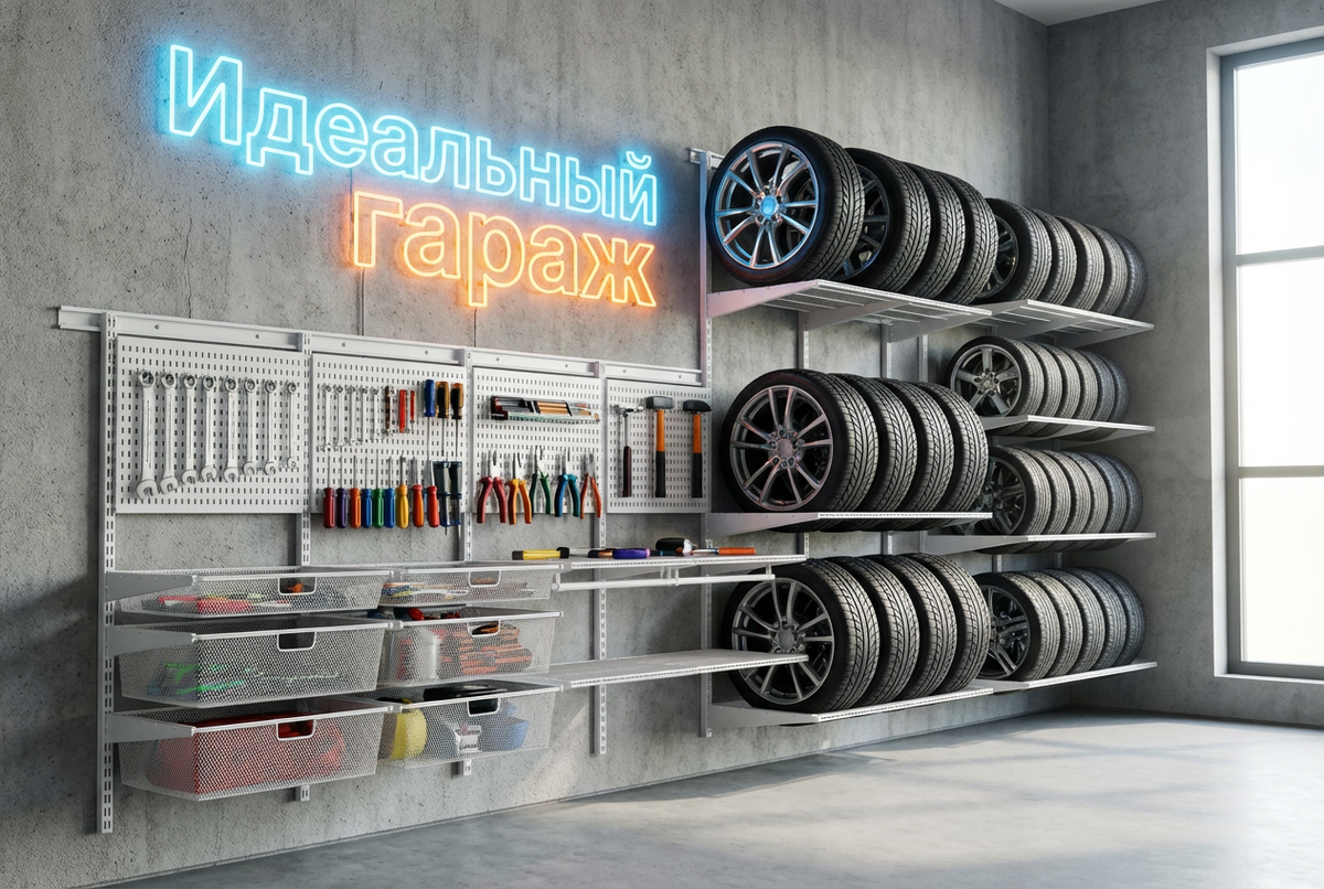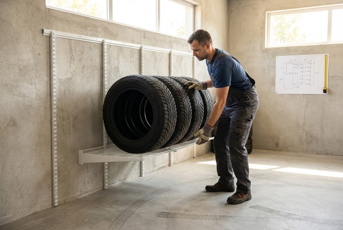 Наша цель простая: зимняя резина стоит спокойно, инструмент под рукой, пол свободен, визуальный шум минимальный.