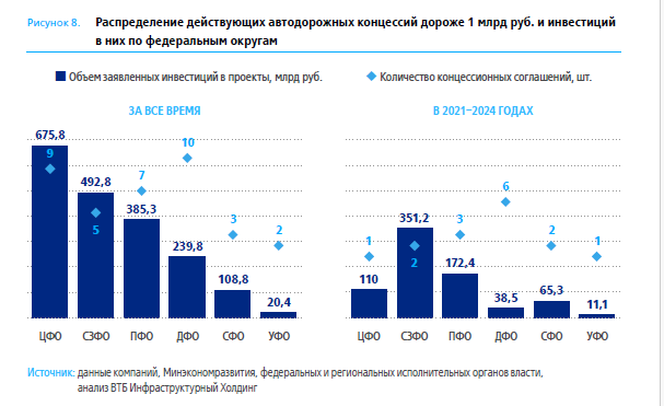 В 2021–2024 годах подписали 15 концессионных соглашений на 748,4 млрд руб., причём более 98% — региональный уровень.