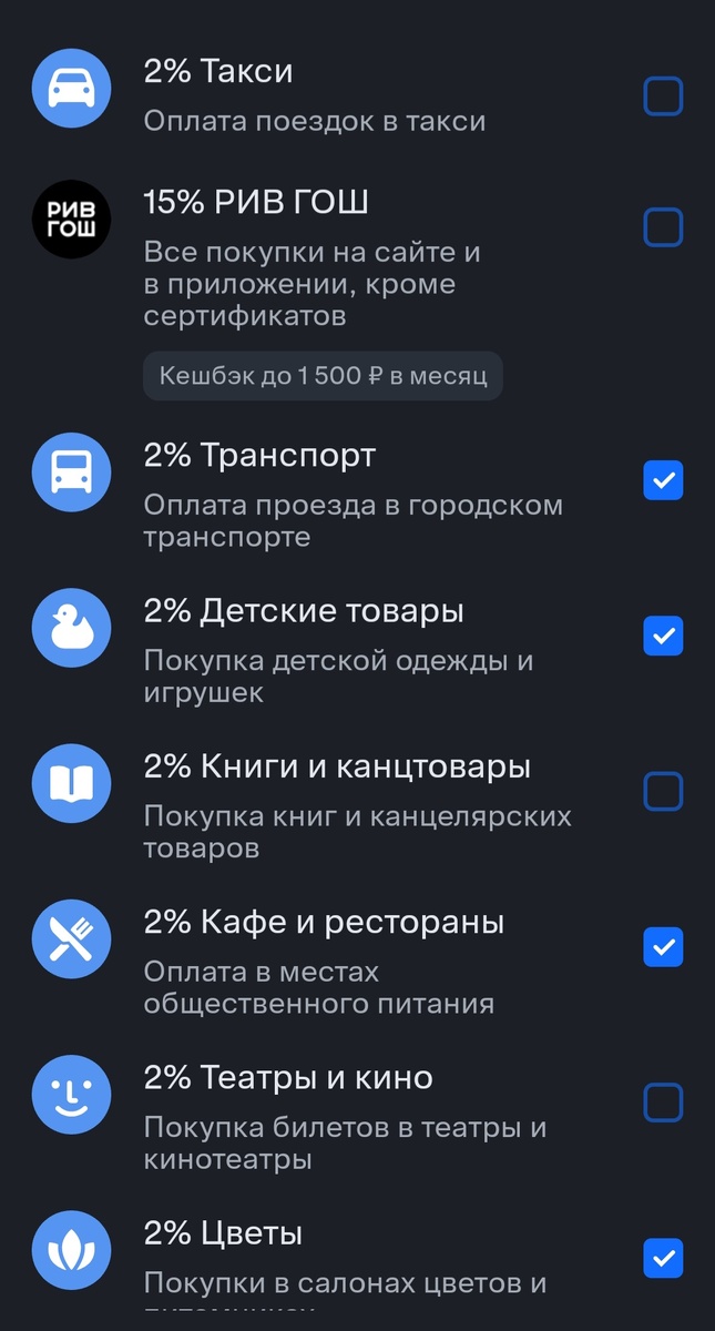 Внушительный выбор даёт БКС, мне кажется, тут каждый найдёт интересные категории для себя. Плюсом банк даёт разные плюшки за определённые суммы трат. Например, 14% годовых по накопительному счёту с начислением дохода на ежедневный остаток, для этого нужно потратить от 10 000 рублей в этом месяце.