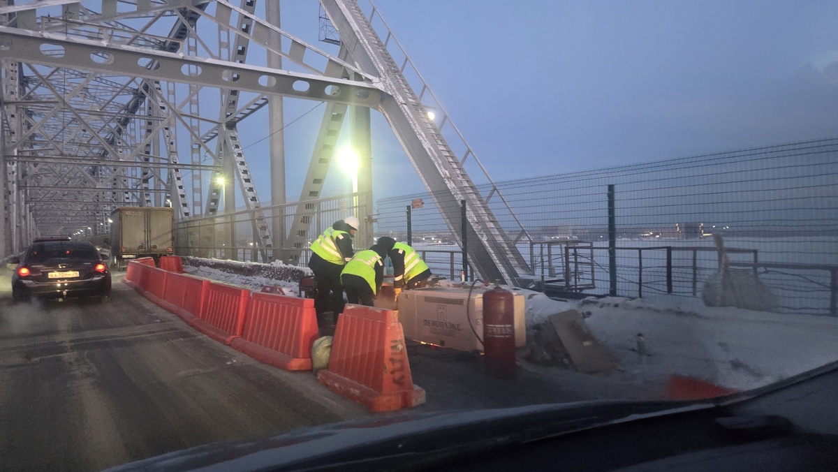 На Северодвинском мосту введено реверсивное движение из-за ремонтных работ. Специалисты устраняют провал на эстакаде на левом берегу