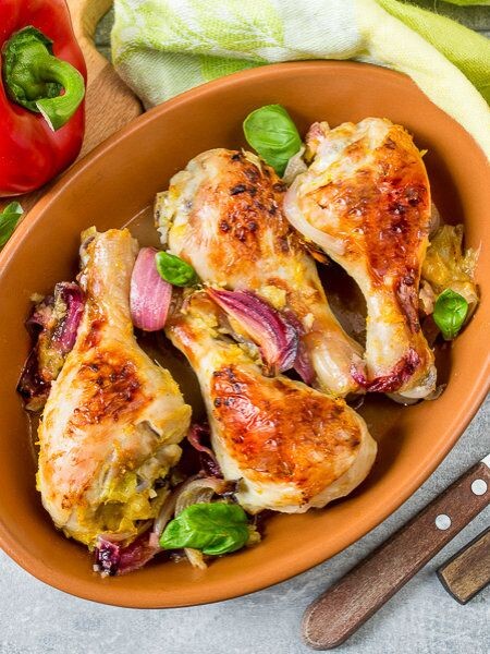 Если голени кажутся сухими — накройте фольгой на первые 25 минут и добавьте немного бульона в форму.