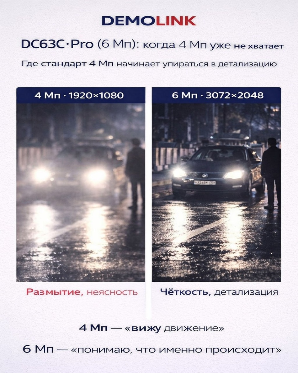 4 Мп сегодня — это нормальный, рабочий стандарт. Но есть задачи, где он физически упирается в предел — даже при правильной настройке камеры. Именно для таких сценариев и нужен DC63C·Pro с разрешением 6 Мп. Где 4 Мп начинает «сыпаться» 🔻 Дистанция На 10–15 метрах движение видно, но деталей уже не хватает — лицо, предмет, номер теряются. 🔻 Широкий угол Нужно закрыть двор, парковку или проезд. Чем шире сцена — тем меньше пикселей на объект. 🔻 Цифровой зум Любое приближение быстро превращается в «кашу». 🔻 Видеоаналитика Линии и зоны работают, но уверенность детекции падает из-за нехватки информации в кадре. Что реально даёт 6 Мп на практике ✅ Больше пикселей на объект Не интерполяция, а реальная детализация. ✅ Рабочий запас под зум При увеличении изображение остаётся читаемым. ✅ Стабильнее аналитика Детекция людей, пересечение линий и вторжения работают увереннее. ✅ Баланс обзор / детализация Можно держать широкий угол и не терять смысл картинки. Важный момент, который част